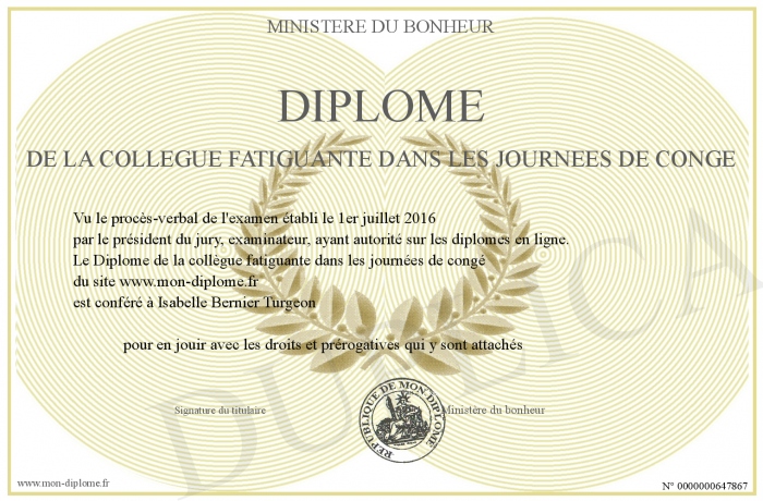 Envoyez par email votre Diplôme de la collègue fatiguante dans les journées de congé personalisé