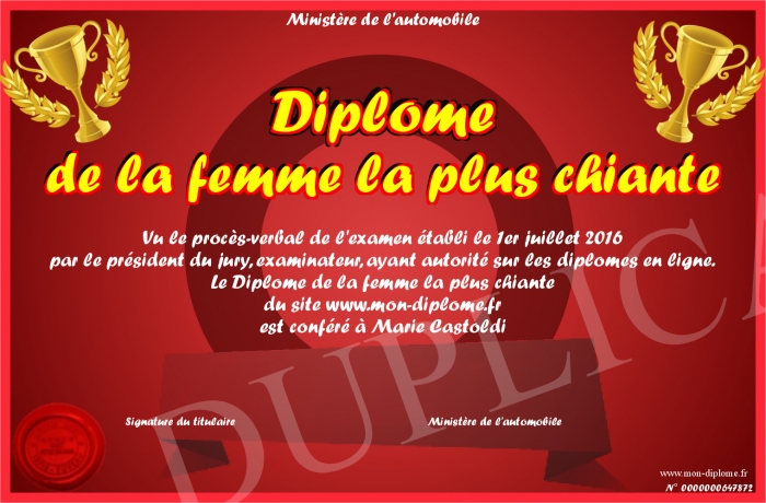 Envoyez par email votre Diplôme de la femme la plus chiante personalisé