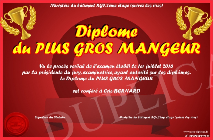 Envoyez par email votre Diplôme du PLUS GROS MANGEUR personalisé