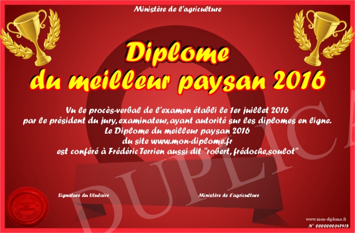 Envoyez par email votre Diplôme du meilleur paysan 2016 personalisé
