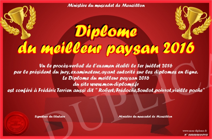 Envoyez par email votre Diplôme du meilleur paysan 2016 personalisé