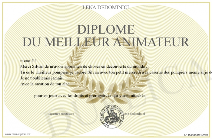 Envoyez par email votre Diplôme du meilleur animateur personalisé