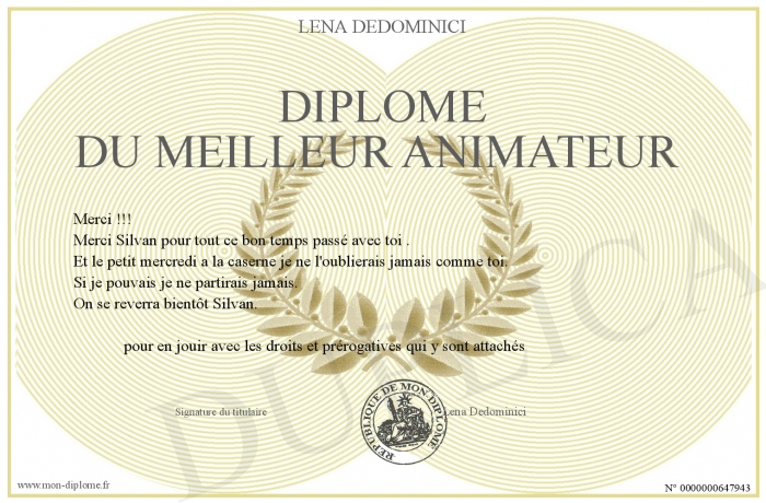 Envoyez par email votre Diplôme du meilleur animateur personalisé