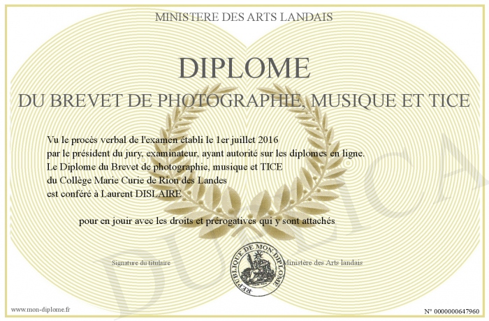 Envoyez par email votre Diplôme du Brevet de photographie, musique et TICE personalisé