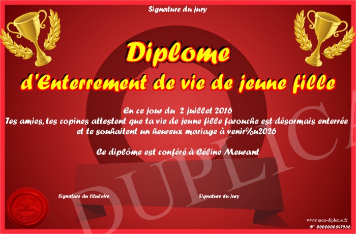 Envoyez par email votre Diplome d'Enterrement de vie de jeune fille personalisé