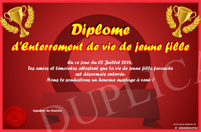 Envoyez par email votre Diplôme d'Enterrement de vie de jeune fille personalisé