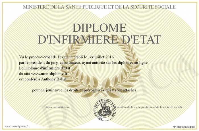 Envoyez par email votre Diplôme d'infirmière d'Etat personalisé