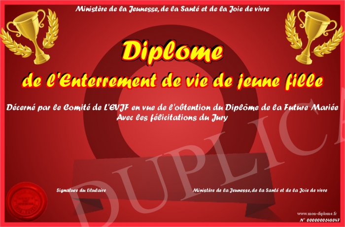 Envoyez par email votre Diplôme de l'Enterrement de vie de jeune fille personalisé