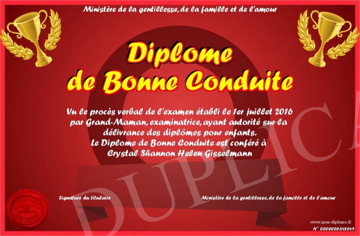 Envoyez par email votre Diplome de Bonne Conduite personalisé