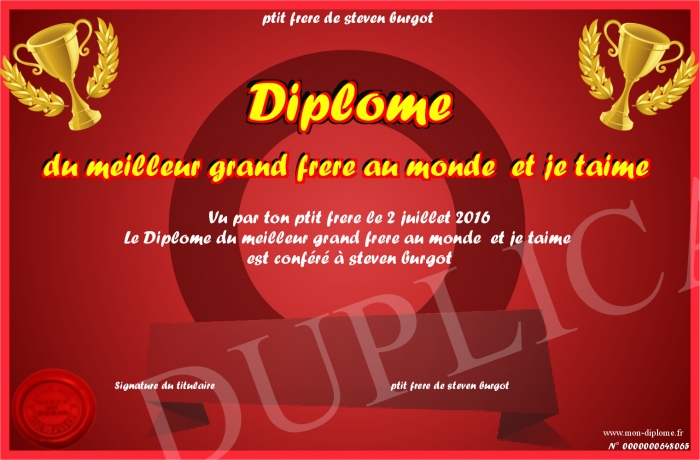 Envoyez par email votre Diplôme du meilleur grand frere au monde et je taime personalisé