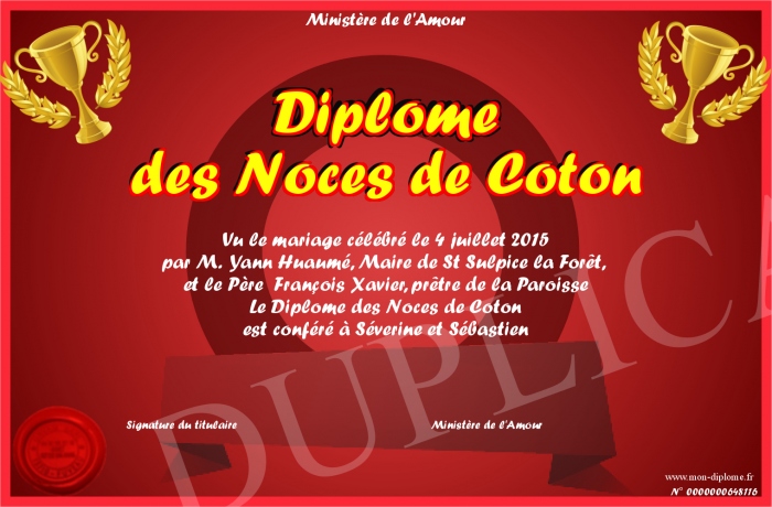 Envoyez par email votre Diplome des Noces de Coton personalisé