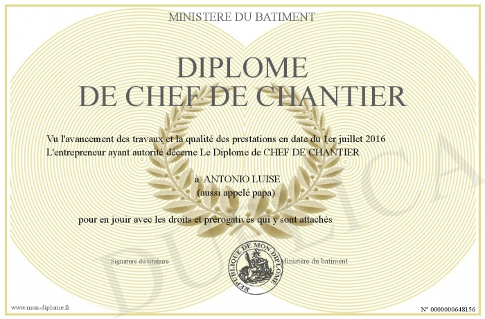 Envoyez par email votre Diplôme de CHEF DE CHANTIER personalisé