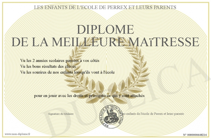 Envoyez par email votre Diplôme de la meilleure maïtresse personalisé