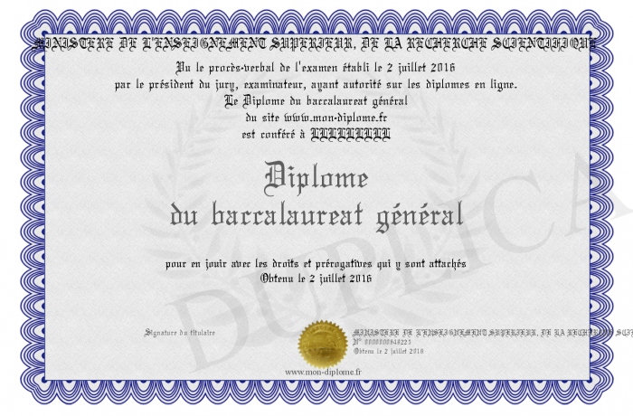 Envoyez par email votre Diplôme du baccalaureat général personalisé