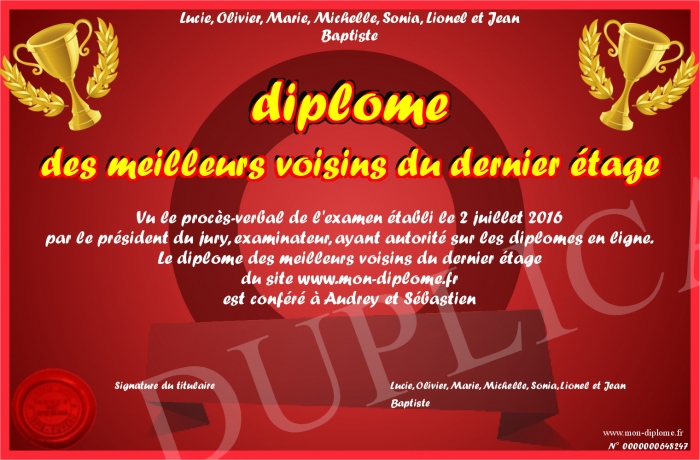 Envoyez par email votre diplôme des meilleurs voisins du dernier étage personalisé