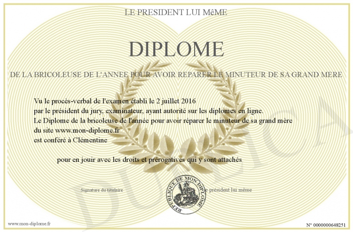 Envoyez par email votre Diplôme de la bricoleuse de l'année pour avoir réparer le minuteur de sa grand mère personalisé