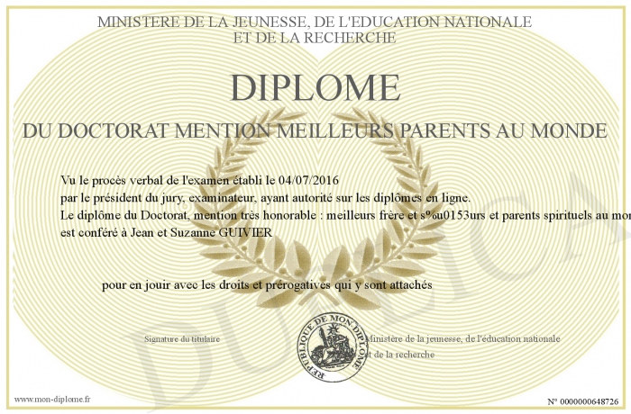 Envoyez par email votre Diplôme du Doctorat mention meilleurs parents au monde personalisé