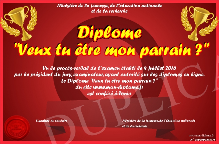 Envoyez par email votre Diplôme -Veux tu être mon parrain ?- personalisé