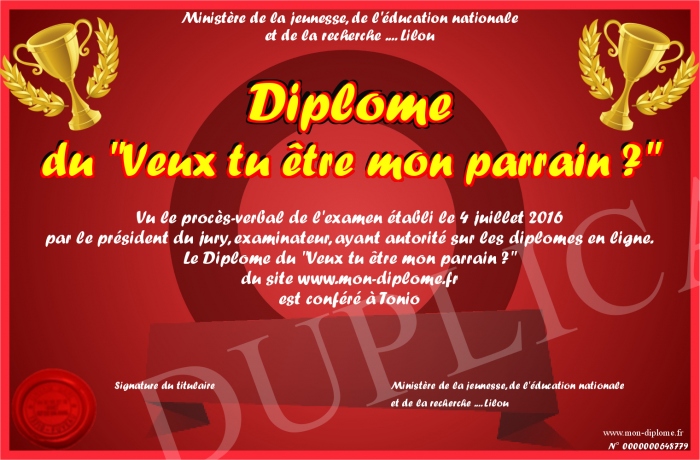 Envoyez par email votre Diplôme du -Veux tu être mon parrain ?- personalisé