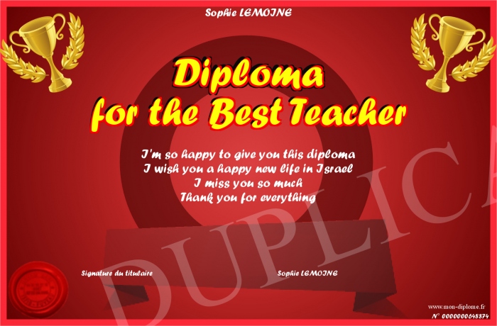 Envoyez par email votre Diploma for the Best Teacher personalisé
