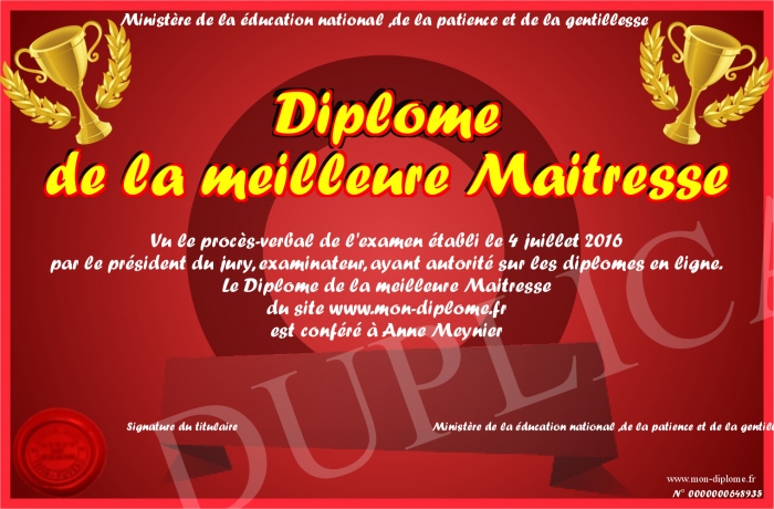Envoyez par email votre Diplome de la meilleure Maitresse personalisé