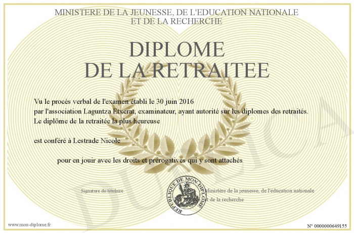 Envoyez par email votre Diplôme de la retraitée personalisé