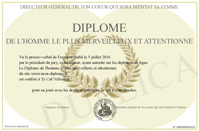 Envoyez par email votre Diplôme de l'homme le plus merveilleux et attentionné personalisé