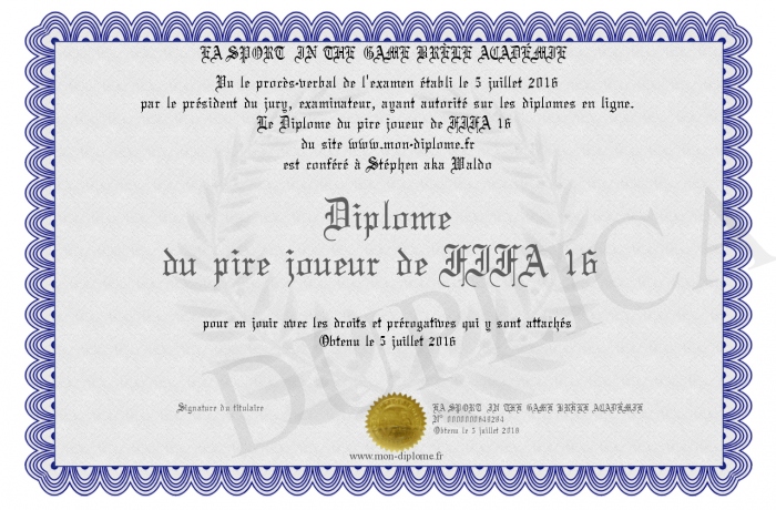 Envoyez par email votre Diplôme du pire joueur de FIFA 16 personalisé