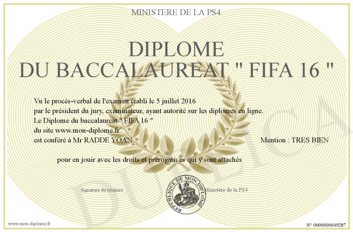 Envoyez par email votre Diplôme du baccalaureat - FIFA 16 - personalisé