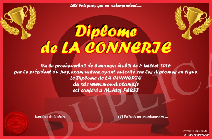 Envoyez par email votre Diplôme de LA CONNERIE personalisé
