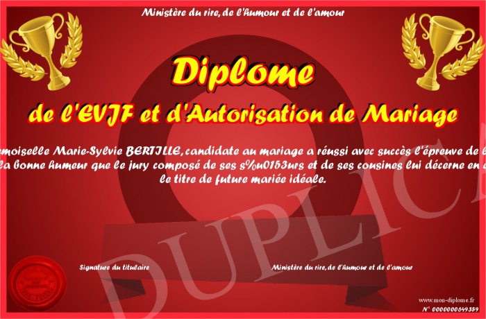 Envoyez par email votre Diplôme de l'EVJF et d'Autorisation de Mariage personalisé