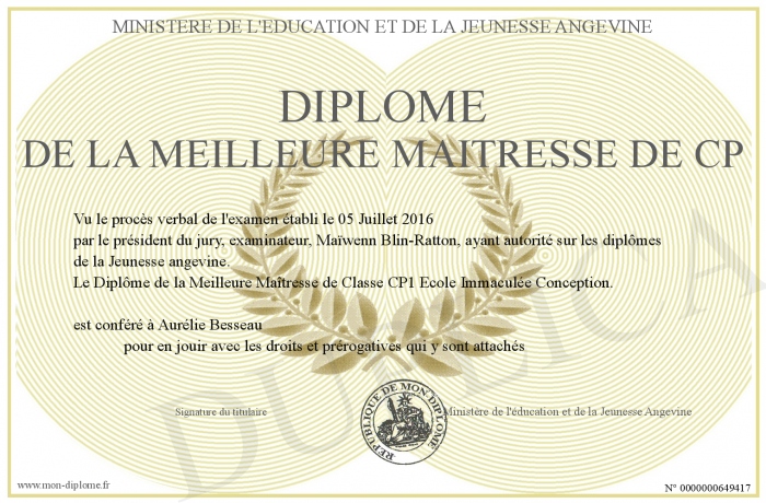 Envoyez par email votre Diplôme de la Meilleure Maitresse de CP personalisé