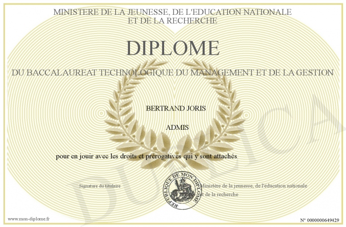 Envoyez par email votre Diplôme du baccalauréat technologique du management et de la gestion personalisé
