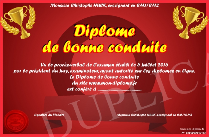 Envoyez par email votre Diplome de bonne conduite personalisé