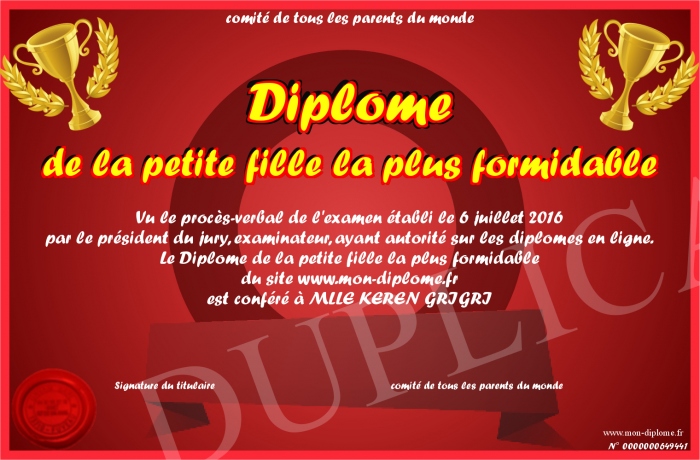 Envoyez par email votre Diplôme de la petite fille la plus formidable personalisé