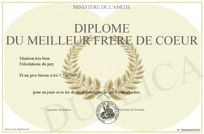 Envoyez par email votre Diplôme du meilleur frère de coeur personalisé