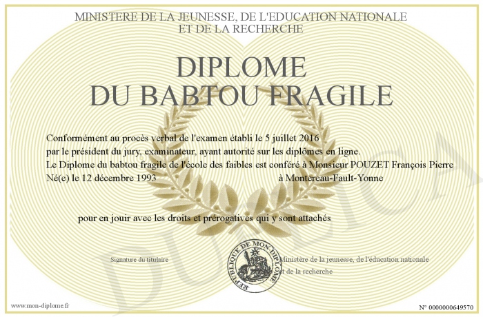 Envoyez par email votre Diplôme du babtou fragile personalisé