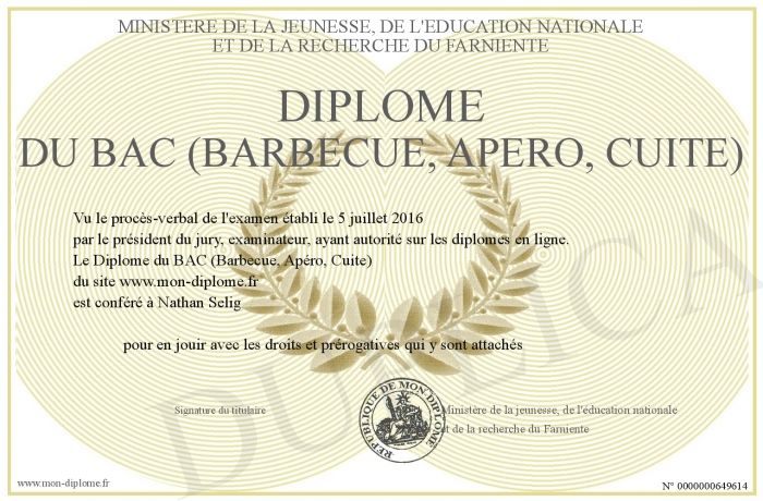 Envoyez par email votre Diplôme du BAC (Barbecue, Apéro, Cuite) personalisé
