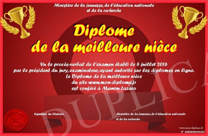 Envoyez par email votre Diplôme de la meilleure nièce personalisé