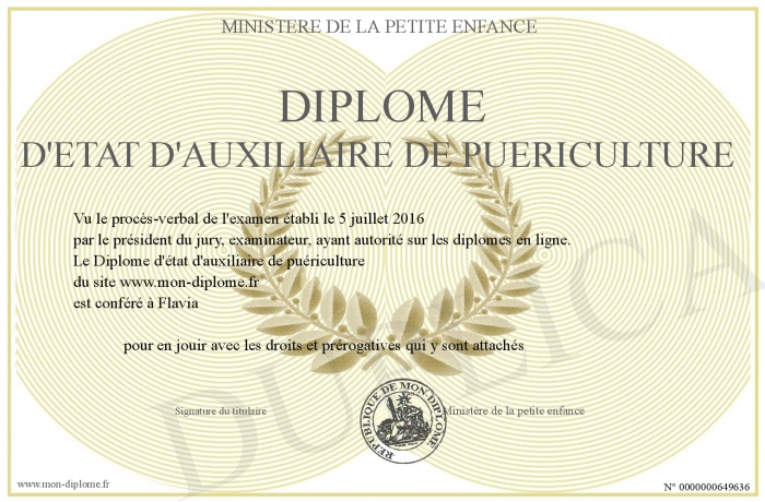 Envoyez par email votre Diplôme d'état d'auxiliaire de puériculture personalisé