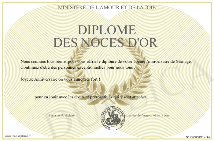 Envoyez par email votre Diplome des Noces d'Or personalisé