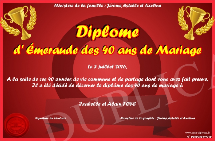 Envoyez par email votre Diplôme d' Émeraude des 40 ans de Mariage personalisé