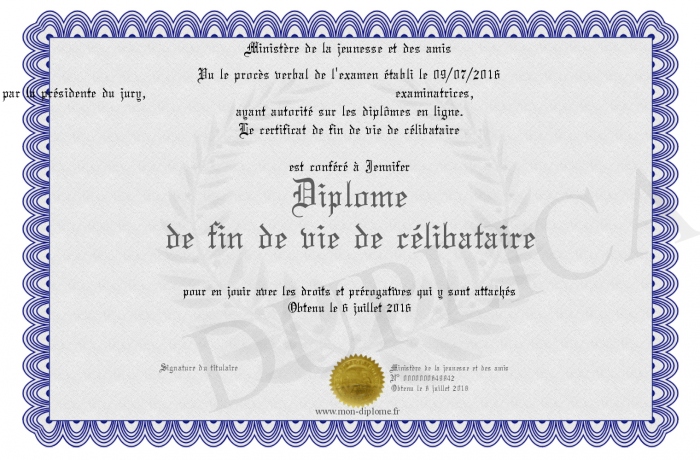 Envoyez par email votre Diplôme de fin de vie de célibataire personalisé