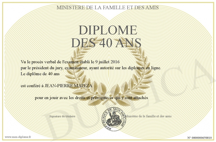 Envoyez par email votre Diplôme des 40 ans personalisé
