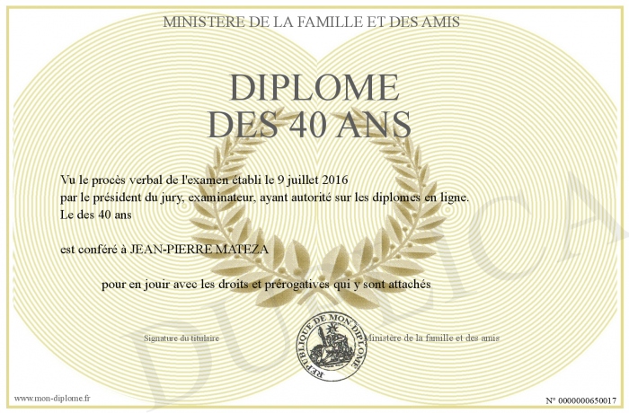 Envoyez par email votre Diplôme des 40 ans personalisé