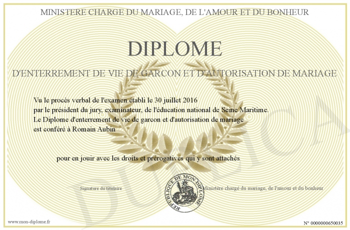 • Diplôme d'enterrement de vie de garcon et d'autorisation de mariage