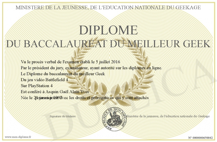 Envoyez par email votre Diplôme du baccalaureat du meilleur Geek personalisé