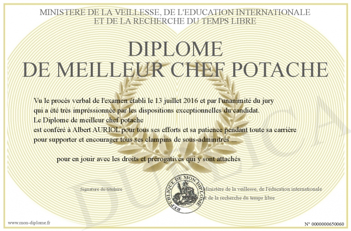Envoyez par email votre Diplôme de meilleur chef potache personalisé