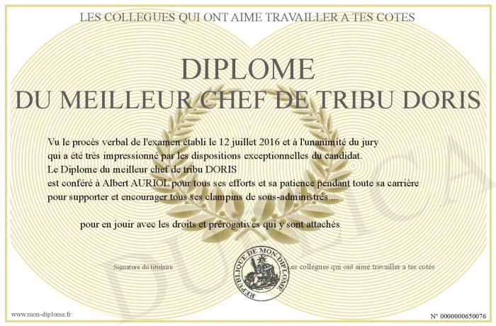 Envoyez par email votre Diplôme du meilleur chef de tribu DORIS personalisé