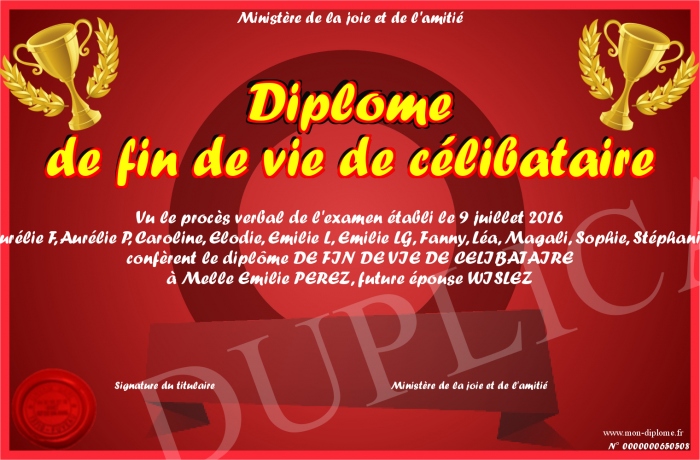 Envoyez par email votre Diplôme de fin de vie de célibataire personalisé